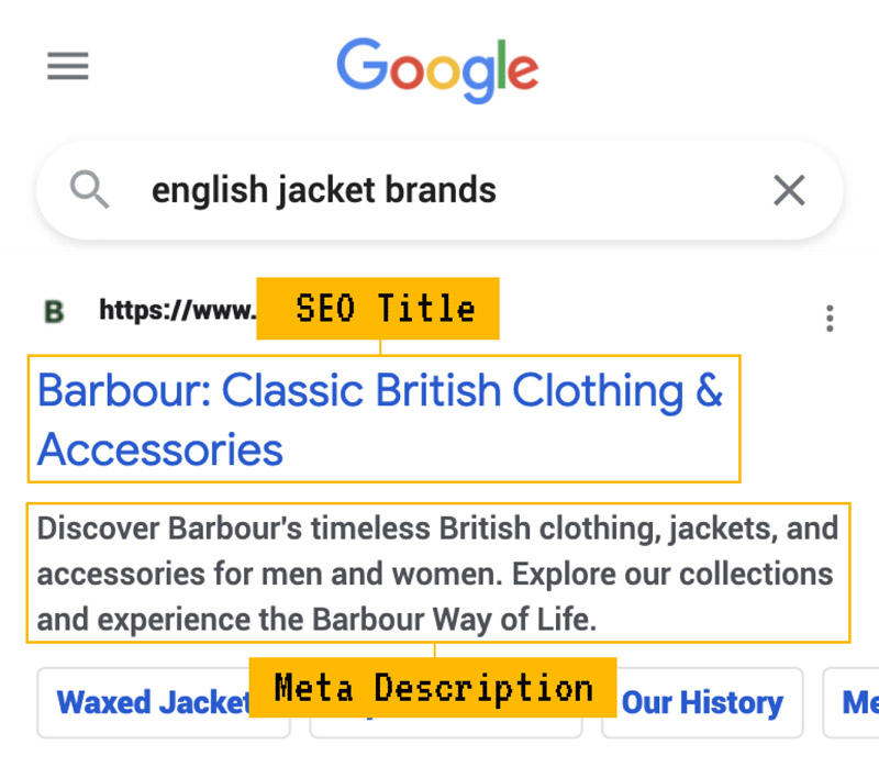 | https://www.barbour.com/ | Discover timeless Barbour jackets, clothing, and accessories for men, women, and children. Explore our collections and find the perfect gift for any occasion. | Barbour Jackets, Clothing & Accessories for All | Official Site | Timeless Barbour Outerwear & Fashion Essentials | Shop Now | Classic Barbour Jackets & Apparel for the Whole Family | Barbour Father's Day Gift Guide 2023 | Festival Outfit Ideas and Essentials for 2023 | Most Popular Barbour Jackets | Choosing the Perfect Work Bag | Barbour Wax Jacket - Classic Style | Barbour Quilted Jacket - Comfort & Warmth | Welcome to Barbour, the home of timeless jackets, clothing, and accessories for men, women, and children. With a rich heritage and a commitment to quality, our collections offer a range of stylish and functional pieces that cater to various occasions, tastes, and needs. From the classic Barbour wax jacket to the comfortable quilted jacket, our outerwear is designed to keep you warm, dry, and looking your best. Explore our Father's Day Gift Guide for 2023, featuring a curated selection of thoughtful and unique gifts that will show your appreciation to the father figures in your life. As festival season approaches, check out our Festival Outfit Ideas and Essentials to help you pack the perfect wardrobe for every eventuality. Delve into our article on the most popular Barbour jackets to discover the iconic and distinguished styles that have stood the test of time. Choose from wax jackets, gilets, waistcoats, and parkas, each crafted with attention to detail and designed to elevate any outfit. When it comes to work bags, Barbour has you covered with a variety of options tailored to your needs. Learn how to select the right bag for your daily commute or remote work setup with our guide on choosing a work bag. In addition to outerwear and accessories, Barbour offers a range of clothing and collaborations, such as the Barbour x House of Hackney collection, featuring bold prints and versatile styling options. Discover how to style a trench coat with inspiration from London and Milan fashion week, and explore our top North East beauty spots with accompanying style guides for each adventure. Join the Barbour People community and immerse yourself in the Barbour Way of Life, celebrating the spirit of those who wear and love our brand. | burberry quilted jacket, jackets online, wax jeans | The three keywords selected were based on their relevance to the on-page content, search volume, and keyword difficulty. 'burberry quilted jacket' has a search volume of 3900, keyword difficulty of 3, and a position of 51, making it a suitable choice for optimization. 'jackets online' has a search volume of 900, keyword difficulty of 44, and a position of 14, offering potential for improvement in search ranking. 'wax jeans' has a search volume of 8600, keyword difficulty of 1, and a position of 96, providing a good balance between search volume and ease of ranking improvement. | ||||||